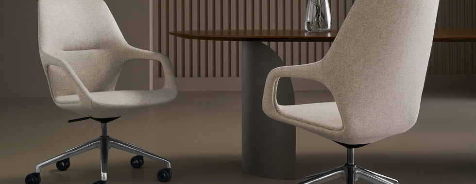 JeLa is a sculptural seating collection by German design duo jehs+laub, defined by its fluid, fully upholstered silhouette and signature open-arm form. Offered as a conference, guest, or multi-use chair, JeLa combines elegant curves with exceptional comfort and upholstery innovation — featuring seamless patterning that wraps the seat, back, and arms in a continuous, tailored form. With multiple base options, mid- or low-back heights, and extensive finish choices, JeLa brings a refined, modern sensibility to offices, lounges, and collaborative spaces alike.