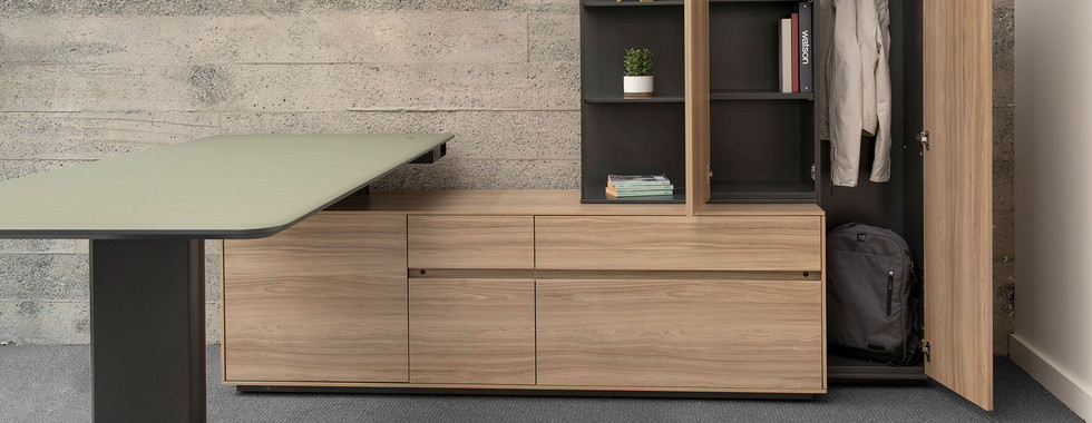 Storage options include a freestanding credenza, sideboard, and secondary stacking storage that come in locker and wardrobe styles; a range of sizes and shelf/door/drawer combinations give designers ultimate flexibility